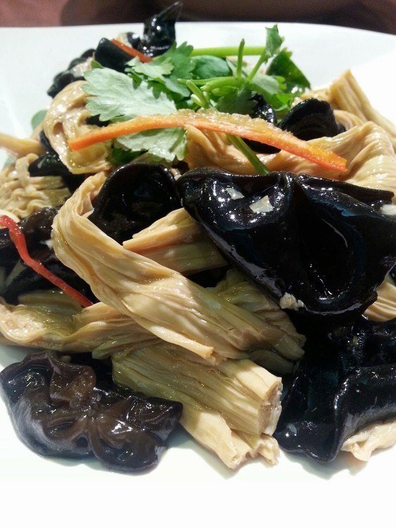 凉拌支竹:好清爽的一道菜,适合夏天食用,用葱油和酱油将白灼后的支竹、木耳拌匀,盘底用葱段垫底,更突显清香。