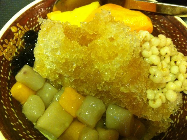 不记得我点的是仙芋几号了,反正是有地瓜的,因为芋圆和地瓜这两种我都喜欢,上来中间是刨冰,还有珍珠、薏米,份量很大,吃到后来进来等位的人给在坐的人很大压力啊,最后只能加快速度吃完。圆子的味道让我失望,太重的香精味了。其他都还好。