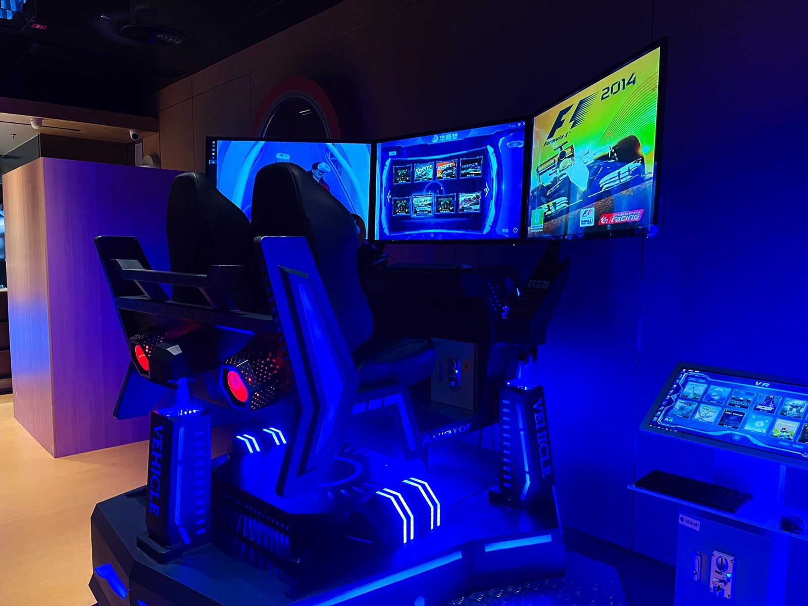 離開泡池區,娛樂區藏着更多驚喜。這裡可謂應有盡有,場内匯集了VR體驗、賽車模擬器、經典街機、PS5主機以及電競級網吧等多種娛樂設施。對於熱愛遊戲的港人而言,在此定能盡情暢玩。此外,場內還設有互動投影區與天幕舞台餐廳,不定時會有歌舞表演,遊玩之餘還能欣賞精彩演出。