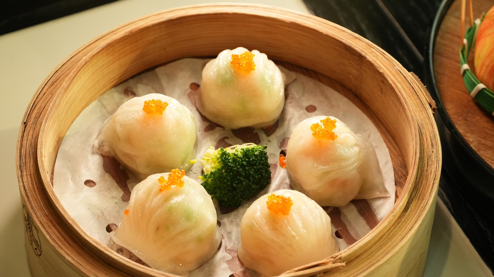 鮮蝦餃是廣府早茶的必點菜品,師傅選用新鮮蝦仁,搭配豬肉、貢菜、筍丁等食材調製餡料,再以澄粉製作薄而透明的餃皮,包裹成半月形,褶紋均勻,面上點綴了黃色魚子醬,外觀精緻。蝦餃入口鮮美爽滑,蝦肉彈牙,回味甘甜,一口不過癮,吃完總忍不住想再夾一隻。