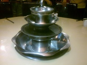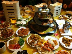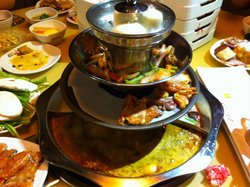 地点就在国际商场的楼上,记得是B座,不是A座。汽车站就是滨江道,地铁站就是营口道,怎么去就不说了,3分钟说不完。。。每次去都是团购,价格大概啊45到50之间,各大网站有些小差异,但是总体是这样。他们家最有特色的是那个锅子,从下面数起来,第一次是涮,第二层是烧烤(效果比较差),第三层是干锅(效果更差),最上面是蒸(这个还OK)。但是其实真的吃起来,基本都是涮,上面的没有多少人在意,因为一来太慢,二来效果不好。团购的45~50之间,我就不一一写价格了,都一样哈!羊肉片/牛肉片,3颗星就是外面50块自助那种,不过相对要更有品质一些,这也是他们那边人比较多的原因吧?都是一盘子一盘子的,下起来很方便。鸡翅,4颗星是翅根,不是翅尖,很有肉,都特别大,放在第二层的烤盘上面正好。而且好像都之前开口儿了,进过味道,所以吃起来还是不错的。虽然我不喜欢,但是小伙伴反应不错。虾,4颗星个头儿不小,而且补的很及时。虽然不是鲜活的,但是不影响食用。煮出来都很饱满,就是剥起来比较费劲。后来懒得弄了,就没怎么吃。扇贝,4颗星虽然个头儿不大,但是都没有砂子,吃起来很新鲜啊!我就是爱吃这个,所以其他的都是次要的,只要这个够,就可以了。随便蒯一碗,拿回去扔在锅里就等捞就好了,爽!爆肚,3颗星品质还可以,就是切的比较细碎,不太容易夹起来。香蕉干,3颗星有点儿绵了,不过味道不错。但是没怎么吃,原因你懂得。毛豆,2颗星没进味儿啊,差评啊!蛋挞,4星半味道正经不错,比外面点心铺卖的也不差,就是比不上KFC,这都是共识哈!饮料,4颗星良心,没掺水。总结一下,这家曾经在开业的时候去过,当时东西特别全,而且补菜也都挺快的。但是后来再去的时候,显然补菜就慢了,尤其培根之类的。不过我倒是不爱吃那种,也不显得怎么样。扇贝之类的还是挺不少的,我有这个就够了。里面的环境还算过得去,但是就是黑,也是没有采光的原因。一句话:对得起价钱和地段吧!…查看更多