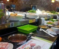 这家店的地点在中关村购物中心B2,一开始把中关村购物中心和步行街搞混了,在步行街里找了半天,后来才找对地方,到店里都1点多了。人不是太多,有3列传送带,店里当时只开了2列,还有一列马上就要关闭了。31元团购的,包括了锅底和小料,只是不包含饮料,所以感觉还挺值。小料是自助的,每人可以单独有一盘羊肉/牛肉/虾(三选一),建议要虾,因为传送带上有肉,虽然吃着好像是肥牛而且真的有点肥。但是锅底涮过虾以后更好吃些,要的虫草锅底,锅内有超细的像是虫草或者是人参的东西,还有小枣。传送带上的种类还是非常丰富的,青菜 肉类 鱼 蛋 水果 点心都有,加汤的壶也在传送带上,必须用夹子不能用筷子夹。就像大多人说的,青菜类以外的新鲜程度一般,但是来吃这家冲的就是性价比,所以以后有团购还会来吃的。