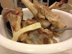 锅底点的是这里的特色,骨头锅。一大砂锅端上来,堆的慢慢的。最上面整齐的围了一层,有蟹肉棒、蛋饺、肉丸、嫩笋尖、蘑菇等等。非常丰富的搭配。这么来一锅,就可以少点几道小菜了。搅动一下,下面才是骨头垫底的。大骨的数量也挺多的。多煮一会儿再捞起来吃更好点,可以让骨头里的精华融到汤水里。里面的蛋饺做的还不错。皮子很薄,但不易破。皮子也嫩,透出里面肉肉的颜色,真是可人。咬开,里面的肉也挺嫩的。笋尖长长的一段段,煮得出鲜美味道。骨头捞起来,吹一吹,吸一吸,里面有带着汤汁的骨髓。骨头上,还带着筋、连着肉肉的,啃起来真是过瘾!…查看更多