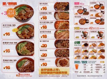 他家是台湾最大的连锁牛肉面店在上海开的分店。店面不大,都是卡座,但是显得很干净明亮。第一次去他家吃,点了店里招牌的肥牛寿喜面,看到招牌上基本上都是面,还在页末提醒客人,可以根据喜好选择宽面或者细面,不过寿喜面里的好像只能选择宽面。在柜台接了单,拿了个牌子找位置做好,不一会,面就做好送到面前了,不用自己凭牌子拿面。同时端上来的,还有两份小碟,一份咸菜和一份酱菜,感觉都是拿来放在面里调味的。寿喜面里的汤底还蛮浓郁的,肥牛片不多,味道也一般,宽宽的面条倒是很有嚼劲,一锅吃完,有些撑了。看到他家的介绍说,每周二到周五,都会有两款原价16元的面特价10元,下次路过可以去试试的。…查看更多