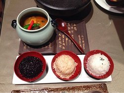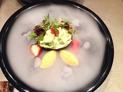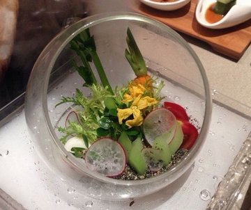 之前试吃活动看到分子料理。一直很长草啊可惜一个月回一次成都,试吃是赶不上的幸运的是微信连续中了两次索性在截止的前一天和朋友来吃地址是在阳光新业楼上。进去验证不是很顺利,本来都想算了,结果成功了可以点149及以下的套餐。189补钱最后决定点了一份149、一份119的筷子很有特色。是可以上个一次性头儿的筷子。既环保手感又好小吃有3碟。菌好吃。茶要分男女女茶,茉莉、玫瑰、山楂。男茶:寿眉、金骏眉、普洱茶。女茶味道很明显啦。男茶感觉是菊花,菊花,普洱……好吧。不会喝茶前菜凯撒沙拉这道菜很喜欢。装在一个木碗里面颜色很分明有肉松。鸡蛋。小番茄。沙拉酱。吐司干。茼蒿?以及不知名的很脆的青菜总之感觉还不错。如果服务员能帮助拌匀的话就更好了,不是很好搅拌绿野仙踪这道菜超级美啊所有菜都装在玻璃球里面。就像盆栽可惜……个人完全不喜欢他的味道啊芝麻糊加色拉酱?全给朋友了蛋据说是低温烹调的分子料理。还好啦。味道其实差不多。有点弹?主菜翅汤牛腩面这道菜也很漂亮啦牛腩。鲍鱼。蔬菜。菌类。玉米以及鹌鹑蛋摆在面上面,好好看面是手工面汤呈黄色。据说是鸡汤味道挺好吃,还喝了些汤、就是面有些软了红焖野生鳖捞饭饭有三种,糯米。香米。糙米这道菜吃起来好麻烦、但是好好吃啊是焖甲鱼。有些辣、不过口感很棒啊汤朋友的是鸡汤?我的是娑罗东啖汤泰式酸辣汤的味道。有只虾有个鸡腿不错甜品焦糖布丁焦糖不够啦不过布丁味道还是不错的。就是有些软了还有有个是盆栽上面是巧克力粉中间是什么奶泡下面是水果,酸的开始吃1.2层不知道有水果感觉好难吃但是加上水果和雪泡在一起感觉还是很棒的。总之,感觉还是不错的。环境超赞啊、如果开始桌上能多拿几张纸就好了89的套餐貌似很多人点啦。感觉也不错。有机会再去…查看更多