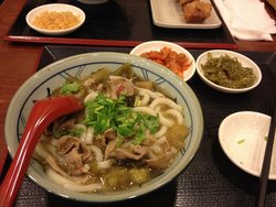 这家店的乌冬面还满有名的,是自助式服务,有点像食堂,拿好吃的以后直接付钱。选了高汤乌冬面,牛肉感觉挺肥的,汤略咸了些,总体还行吧。有自助调料区,可以自己叫作料、葱、香菜什么的。