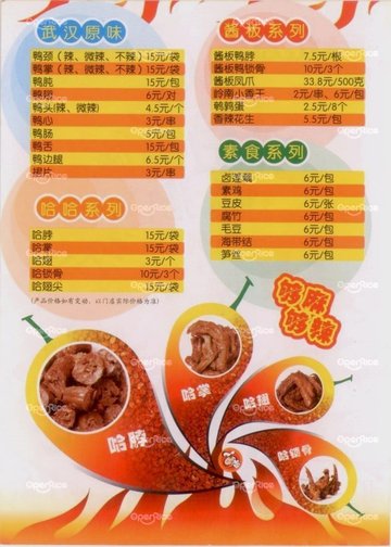 辣的鸭脖子很好吃的,十几块一袋,随便吃吃啦~还有豆腐干也很好吃,5元一袋吧。以前还送一个盒子的,现在没了,就袋子装的。但是还是很喜欢吃的~不错哦!