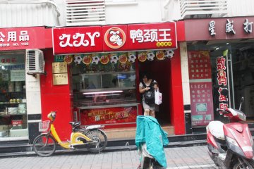 久久丫的鸭脖子不错,有很多种不同的口味,不辣的、微辣的、重辣的、烤的等。吃过一次重辣的,实在太辣了,吃不消呀!还是喜欢微辣和烤的。可以一袋买也可以一根根买。还有一些其他的,海带,豆腐干之类的,不过也是辣的。