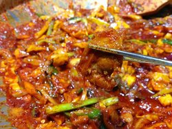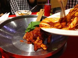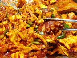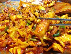 桌上的一个电磁炉已经被部队锅占据了,那另一个电磁炉是用来干嘛的呢?答案就在这里——章鱼鸡肉铁板烧,69元,推荐指数:五颗星。这么一大盘端上来的时候,我还以为是已经炒熟了的,结果发现是生的!这时候服务员系上围裙开始给我们现场制作这道韩国料理了。先把菜连同那只大大的章鱼一起倒入锅中,然后将章鱼剪成段。然后在锅中炒熟就能吃了。章鱼、年糕和鸡肉,款款都很辣。查看更多