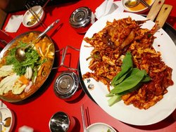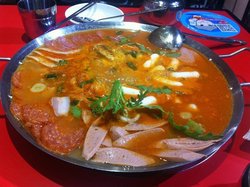 和朋友约在南京西路碰头,地铁出来正好看到这家韩国火锅店,最近韩剧看多了,对韩国美食相当着迷啊,就决定晚饭就是它啦!这家店好像是新开的,生意很好,里面基本都坐满了,幸好最后还剩个两人位,否则就要等号了。点了招牌的部队火锅,特地问了下为什么叫部队火锅,店员说这种韩西式的韩国火锅是从以前朝鲜战争流传下来的,主料就是各类香肠,火腿,加上韩式酱料,还加了年糕和拉面,端上来满满一锅肉,烧开了就是诱人的韩式火锅了,味道不错,而且香肠火腿肉的品质都很好,之前店员还给我们科普了肉的品牌名字,都是外文的没记住哈哈。看旁边桌吃的章鱼鸡肉铁板好像也很好吃的样子,不过因为都是2份起点吃不下了,下次再来吃咯!查看更多