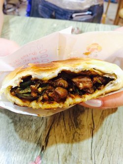 虽然火了有一阵子,但现在还是要排队,等了大约半小时~排队的时候提前会有人把袋子发给你~ 口味挺多,看起来都很诱人,思索半天选了飘香肥肠的,下次再去尝试别的口味。 飘香肥肠味道很不错,油很大很香!吃起来很烫,不是烤好饼子在夹馅进去,而是包好馅儿之后一起进去烤,所以味道融合的很好!而且吃起来一点都不腻~