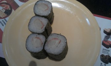 这家回转寿司位于家乐福的一楼,去逛超市的时候吃过两次,寿司是现场制作然后放在小盘子里在滚动条上转动的,你可以根据喜好自行选择,结账的时候会根据你吃的盘子进行计算,也有单点的内容,如果需要可以告知服务人员口味总体一般,没有特别心动的,食材还算新鲜,制作过程比较卫生,价格也不贵,环境略微有点嘈杂
