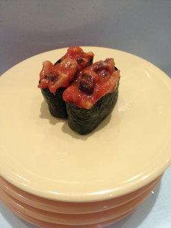 它家的寿司都是现做的,据说在台子上放久了没有被食客取用的话就会扔掉,不知真假。寿司很新鲜,6元一盘,每盘里的数量不一样,主要是根据寿司上面放的食材不同而定。鱼籽的算便宜的,鱼籽数量很多,但什么味也没有。肉松的就是普通的肉松,玉米沙拉的不怎么甜,味道很清香,还有个辣白菜的,口感不是很辣,辣白菜切的很碎,最开始还没看出来,吃到嘴里才感觉出来。