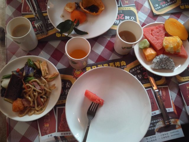 环境还可以,基本都会能看到唱歌之类的表演吧。价钱也不贵,虽然自助餐来说,品种真多不多,但这个价钱就是吃这个了。主打烤肉,大部分都是烤肉,很多帅哥拿着烤肉在餐厅内走动,需要吃的就招手,马上过来了。我比较推荐烤鸡翅的,这个味道比较香。还有牛肉也不错,挺嫩滑的。羊肉有点臊味。餐中还有些热菜和寿司类,但是都做得不出色,看看这个寿司就知道了。还有水果,这个还算比较新鲜吧。…查看更多