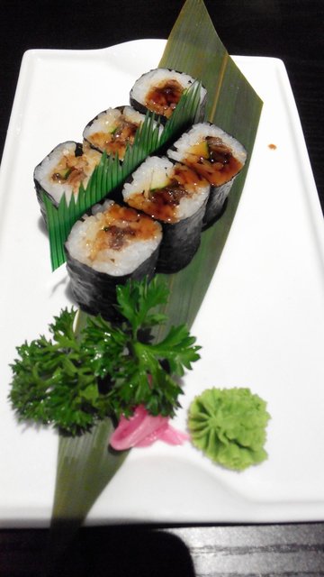 虽然本人不太喜欢日式料理,但是,架不住别人要吃呀。这次居然点到了自己爱吃的!中规中矩的鳗鱼寿司,长盘中斜放了6个寿司,分量还可以。寿司主材料是米饭嘛,所以一个吃完半饱吧,这个寿司比较足,外面紫菜包裹,上面点着鳗鱼酱,唔,很有感觉,吃起来也很美味,吃完一个就想再尝一个,比上次那个好看不好吃的樱花卷强多了,大概是因为我爱吃水产的原因。摆盘也挺好看,底下的粽叶垫底,呵呵,有点端午的赶脚,推荐这个。
