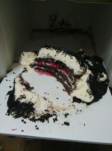 过生日,很兴奋的买了六寸的黑森林,内层蛋糕口感不错,但因为奶油略多,两个人没有吃完,可能蛋糕在柜里是冷藏的,中间的夹层和果肉有冰凉的感觉,口感不错,但是因为没有冰箱,没能及时吃完,所以蛋糕变成了上图的模样,蛋糕的包装不错,样子也跟推荐图片的一致,价钱略贵,也可以接受。总体来说,还算可以的蛋糕。
