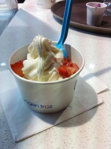 他家的酸奶冰淇淋偏酸奶味不是很浓郁号称是低卡路里,可能没有加糖吧反正我觉得性价比不高25一杯,价格也不便宜选择了原味的,加了草莓好像还有蓝莓和芒果味道的不过感觉也一般吧真心不是很好吃