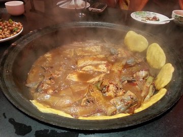 朋友请客选的这里,环境一般,服务很热情,桌子上的大铁锅看着挺有特色的,价格有些贵。满满一大锅的鱼看着非常诱人,各种鱼混在一起煮的,最喜欢的是马哈鱼,鲜美可口,而且香辣入味,味道很赞。锁边鱼的口感也不错,很细腻,就是鱼片吃着有点腻人。