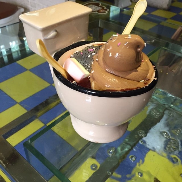 很有创意的一家点,座椅都是马桶的,好可爱,它家的便便冰激凌味道不错,是双色的,巧克力和奶油口味的,冰凉爽口味道不错,还有它家的马桶咖喱鸡饭,鸡肉很嫩,咖喱的味道很浓郁,下面用生菜铺垫这味道不错。