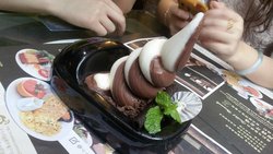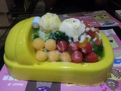 第二次来这家店了,这次带老妈来尝鲜!饭后甜品选择了马桶四号,奇异果口味的,超大冰沙。一开始端上来的时候觉得都是绿色的色素,可是直到吃完舌头都不绿,放心了~水果球很可爱,有西瓜、哈密瓜,布丁和冰淇淋很好吃。查看更多
