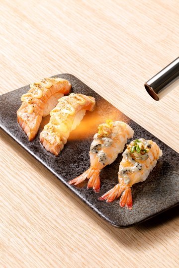 三文鱼刺身 / 炙烧黑松露三味 / 鹅肝寿司 / 甜虾刺身 / 牛肉寿喜烧 / 炸软壳蟹