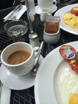 和茶茶&Bai的节日大腐败。茶茶卸货前最后一次出来大吃大喝 天气真是好。嘉里中心这里来吃brunch的人好多。而且这家kabb的brunch可以一直到下午4点。超级赞啊,自然是生意最好的一家 去的时候是11点。外面有些冷。想大大皮等下过来怕她着凉可以坐里面。可是里面只有高脚凳了。大大皮肯定觉得不舒服。服务生说非高脚凳都是预定掉的。没有办法通融。好歹最后给了我们2条毯子。 招牌是烟熏三文鱼水波蛋,可是他们都点牛排,突然我肚子里的搀虫就一下子不太平起来。3份牛排。要的是5分熟。蛋有3种做法:炒蛋/单面煎/双面煎 5分熟的牛排怎么还是那么老。筋筋拉拉的地方很多。质量估计就是网上20多元一块的那种。陪有黑面包一片,蛋,半只西红柿,土豆一堆。量是相当丰盛。黑面包可以沾黄油或者草莓酱。土豆很不错。牛排逊色了些 要的单面蛋就是流黄单,叉子一碰就破的感觉真是好啊 咖啡/红茶还有其他茶可以选。续杯一次 单买的话咖啡也要30+了 一直从11点聊到2点。这么个周末的brunch就过了~十月的阳光很明媚,就是有点冷。毯子必备啊