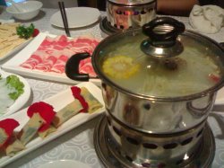 较早前去吃的。比我想象的要小好多。一楼很小,十几平米,主要是做一些免费的服务,只有二张台子。可以免费美早、享用按摩椅、玩具(只几个)、量血压。想美甲,但美甲师在同熟人做,放弃。二楼十来张桌子,桌子上花瓶中插着大朵的假花。椅子是紫色,靠垫颜色显旧,有些脏。配着紫红色的纱幔。环境还算干净,光线不错,但布置得有些凌乱。空调可能没开,好热。洗手间小、旧,不过提供女性卫生用品和一次性马桶垫,倒令人有些惊讶。店的生意倒是一般。服务还不错。上菜挺快的。提供围兜,倒真有用,吃完发现上面不少油点。这里的火锅是小火锅,比一般的涮涮锅精致。有十几种锅底可以选择,辣的、不辣的、甜的、水果味的。涮菜品种不少,肥牛、羊肉,鱼滑、鱼丸,素菜,菇类。价格不便宜。选了骨头王锅:料蛮丰富的。一块大骨头加金针菇、百叶、玉米。汤色乳白,较浓,喝起来味道较鲜。不过可能加了不少味精,过后口好干。另选了一份番茄锅:较单调,只有几片番茄。酸甜味较重,但涮菜并不好吃。调料是自助的,有十几种酱料可选,竟然有五香牛肉。很丰富。小吃是豆片和香蕉片。香蕉片有了哈味。都不新鲜,不够酥脆。没吃几个。水果只上了一次,西瓜、哈密瓜和一块火龙果。饮料有酸梅汤和竹蔗水。酸梅杨中还泡了中药,虽有些药味,但可以下火。竹蔗水中也有不少料,味道较浓。肥羊:切得太薄,很容易破碎,放久了就粘在一起。味道还行,很嫩,有些鲜味。肥牛:也容易碎。较嫩,还行。鸭血:装在大大的酒杯里,是新鲜的,一片腥红。非常嫩滑,没有腥味,很好吃。香菇:没洗干净,有沙,也没什么香味,不好吃。土豆片:还行。蔬菜沙拉:生菜为主,沙拉酱太甜腻。舞面:第一次看见有人舞面,上下翻飞,险象环生。舞面的师傅已做了一年了,很熟练。面条较宽,有点厚,有嚼劲,好吃。感觉还可以。…查看更多