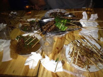烧烤摊这种东西就是要大家结伴来吃,有味道,蔬菜必点蒜苗!好吃,年糕啦,鸡翅啦,都必须点,觉得没饱 烤馒头也是一大选择啊,~味道还是不错的,生意也不错的,毕竟这里有校园