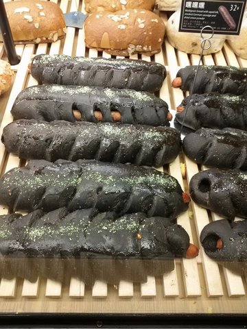 原麦山丘的价格是够贵的,动辄二三十块钱的,不过款式也不是太多,吃来吃去也就是那么几样,还有一个确定,就是没有保温,吃着经常都是凉凉的了,好歹弄点温热的啊。嘿嘿嘿是比较有特色的一个面包了,是加了很多的墨鱼汁的,一吃就知道,鲜鲜的腥味,而且墨鱼汁不是表面的,里面也都是这个味道,香肠是完整的一条,但是相比之下,墨鱼汁的味道甚至更浓一些,外皮有点脆的。