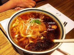 面还挺筋斗的,比味千拉面好的多,其他没什么特别之处。面有宽面和细面,一般都吃宽面,牛肉很大份,很厚实,炖的也很酥,个人觉得牛筋比牛肉好吃,一直点半筋半肉,喜欢牛筋的可以点全筋的,牛筋比牛肉入味。汤是红汤,光喝汤的话有点咸,不喝汤就无所谓了。但是总体来说很不错,是我吃过的牛肉面里面最好吃也是最实在的,对得起这个价钱。听说小食也都不错,但是没吃过,一般都是中午休息的时候吃个面,因为面的分量很足,超大碗,光吃面就很饱了。