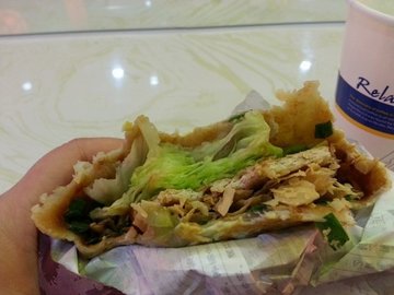 口留香煎饼 地址: 海淀区西直门北大街32号枫蓝国际购物中心法宝超市B1楼(文慧桥东北侧).不是很大的一个档口,很干净,小姑娘动作很熟练,摊煎饼很快的速度呢,口味也还行。要了那个双蛋的口味,而且特意多放了蔬菜,营养丰富,口味清爽,刷的那个黄酱味道也不错,咸淡合适。