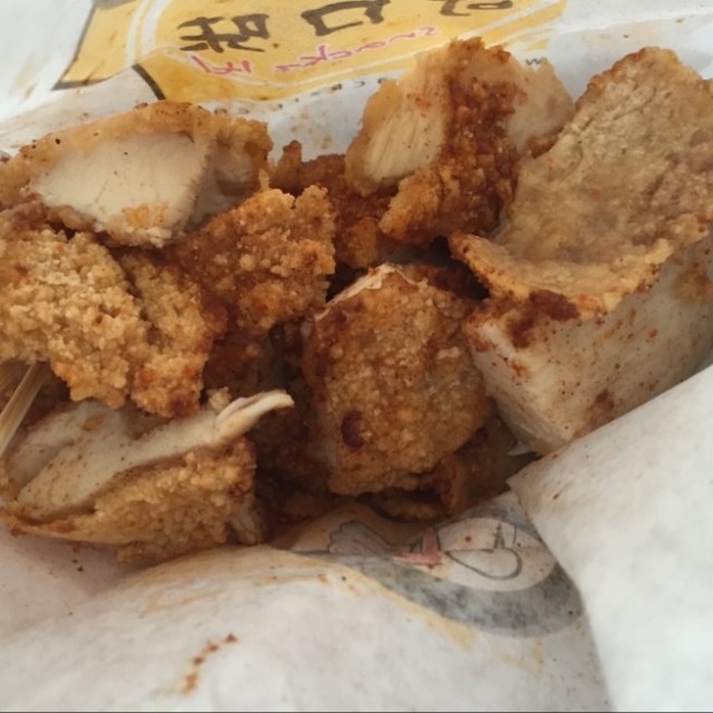 可口味他家是买小吃的,有各种鸡肉、鸡排,生意还不错,我点了一份他们的招牌鸡排,等了5分钟,现场出炉的,很新鲜,放了辣粉和梅子粉,酸酸甜甜的,不是太辣,很香,鸡肉很嫩,有一点点汁水,挺好吃的