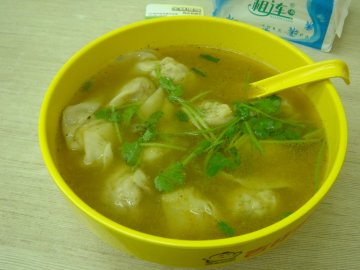 店堂很新,应该是刚开没多久吧 呵呵 分店的馄饨和其它店的差不多阿,有全家福的,有单一口味的.我没点全家福 因为里面有什么荠菜嘿嘿 我不是很喜欢.就单点的玉米猪肉口味的阿,馄饨个头大,皮子薄,猪肉因为有了玉米 所以吃起来比较甜 很喜欢.再配上香菜 很增进食欲哦