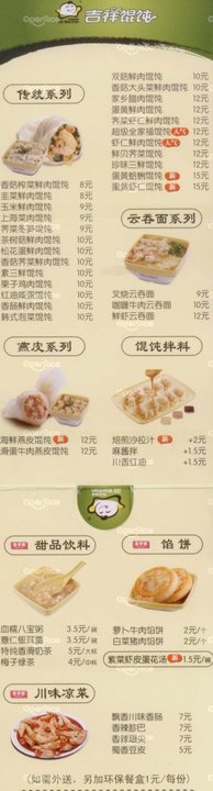 周末和老公午饭必选!喜欢吃小馄饨,小馄饨的馅有海鲜味,很鲜,而且还送蛋花包,丰富了汤底!老公喜欢吃香肠鲜肉,咸蛋鲜肉。他们的馅饼也不错,哦,对对。还有豆皮,以前有海带丝的,现在没有了,豆皮很好吃 加加热,蛮香的 又不贵,奶茶也好吃!现在好像最近少了很多品种,老板说吉祥馄饨总部没货,,不知道搞什么。。。还好有小馄饨哦~…查看更多