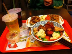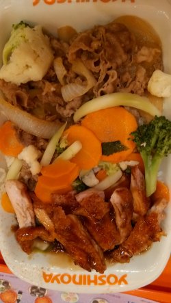吉野家 这是家快餐店中午出来一般也去他家吃饭图个快捷干净店里收拾的确实很干净利落点餐速度也快一般都要双拼其他的有点不够饱双拼份量还挺足的,荤素搭配,味道也可以鸡块比较入味,蔬菜估计就是开水烫烫,没什么味道总体还可以吧。查看更多