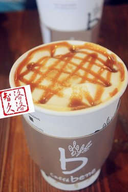 韩式咖啡馆,金秀贤代言,看多了这人真是觉得烦。布置较为简洁,深色地板砖,方木桌,间或点缀着植物,有一点冷冰冰的感觉。咖啡饮料较多,也有简餐和甜品,咖啡一杯30多元。点单后惯例会给一个震动提示器,饮料做完自已去取。奶油焦糖拿铁:端上来是温的,喝起来咖啡味道还行,奶油不甜腻,只是放了一会冷了,奶油结成小团,看着让人没食欲。总体感觉还行,其实它家最吸引人的是冰品,夏天有机会吃吃。