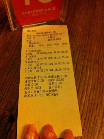 餐厅: 咖色啡语 地址: 西城区西直门外大街18号金贸大厦A座1楼西南角 闺蜜推荐的地方,一级棒啊。环境超级赞,非常有情调,特别适合聊天谈心,有一整面书架,可以从上面拿各种书来看。服务员也不会一直在你身边站着,感觉特别自在舒服~!有免费的wifi,有盆栽,适合自己静静休息,发呆各种,哈哈。 食物方面喜欢松饼,现做的哦,非常好吃。红石榴汽水儿有点失望的说,感觉就是雪碧么,不知道和红石榴有什么关系啊···