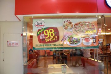 新奥购物中心有家品奇比萨,他家环境不错,人也不多价格也比较实惠,主要是在这儿吃饭可以免费停车。超级培根比萨很大一张,上面是香嫩的培根和浓郁的芝士,味道超级棒,还有自助沙拉,如果是大胃王绝对要点自助沙拉,超值的。意面也不错,劲道好吃。空调很足,很舒服。
