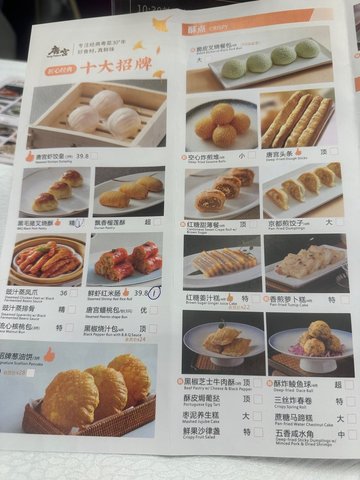 唐宫金奖乳鸽/半只 / 唐宫虾饺皇 / 唐宫烧鹅皇/只 / 沙姜去骨猪手 / 豉汁蒸凤爪 / 飘香榴莲酥