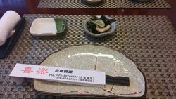 【位置】在上海路和华侨路十字路口的附近,虽说也是位于上海路,但是喜乐并没有处于餐饮聚集的那一段路上。【环境】门面有点小,进门后却别有一番天地。一条走廊直通楼梯,走廊左侧是包间,用的是典型的日式隔板。上楼后,就是大堂。家具以木质为主,感觉很典雅。【菜品】1、中华海草。第一次吃,有点像某连锁卤菜店卖的海带丝,但偏软,口味也比较清淡。作为前菜而言,还是比较能调动胃口的;2、刺身拼盘,内含三文鱼、章鱼、北极贝各2片。盘内装饰,配上干冰产生的烟幕效果,真可是视觉上的享受。食材呢,口感还是不错的,个头也不小;3、牛肉豆腐锅。如名所示,主要食材就是豆腐和牛肉,另外搭配了一些蔬菜,上桌前还在最上面打了一个生鸡蛋。很实在的一个锅,牛肉不少,略微有点甜。最后是就着米饭吃的,蛮下饭;4、烤松板雪花猪肉。最喜欢的一道菜,可惜就两串。上桌后,老板娘提醒要趁热吃。虽说是趁热,但入嘴的时候并不会觉得烫。对我而言,肥瘦适中,咸淡正好,有嚼劲;5、蔬菜天妇罗。种类真不少,吃出来的有茄子、青椒、胡萝卜、金针菇等。可蘸调料,也可直接吃,都不错;6、加州卷。上面的鱼籽真是好吃,QQ的,一颗颗吃起来也比较有趣;7、味增汤。对这个没啥研究,也算是第一次喝。不咸,比较适合最后清口;8、芥末章鱼。这是我自己点的,也是我情有独钟的一道菜。据老板娘说,芥末章鱼是进口来。这次的感觉,很温和,还缺点“冲”的感觉,可能是我比较重口吧。除了以上的日料,喜乐还提供午饭定食。种类相当丰富。【服务】绝对五星的服务,让我有种宾至如归的感觉。老板娘很注意细节,在服务员给我倒水的时候,就提醒服务员要注意我杯子旁的相机,要她把杯子从相机旁拿过来再倒水。在我们走的时候,还会提醒注意脚下。