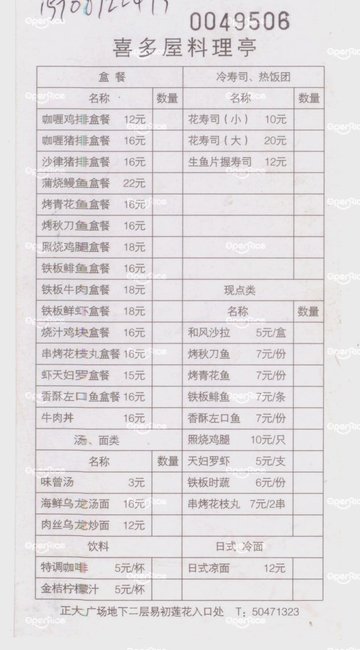 和楼上的喜多屋同属一家,在这里开了个定食小分店,都是阿姨级别的在服务。只能收现金而且不能开发票...三文鱼刺身:38元一份,大概有15片左右,价格倒是很便宜,不过质量你们也懂的,三文鱼放了很长时间,本身新鲜度就不够,选取的部位也不好,有很多筋筋拉拉的口感,芥末完全没有味道...牛肉饭:18元一碗,价格很讨喜啊,量很大,里面牛肉还是很多的,但口感偏甜,再加一个荷包蛋和两片萝卜,只能说,填饱肚子绝对没问题。