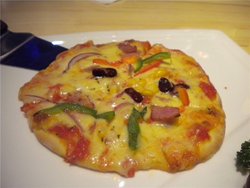 秒杀去的,披萨一块钱,确实很便宜~环境不错,服务相当周到。披萨确实只有4寸大,芝士的火候非常到位,卖相十分诱人。披萨上有红椒,培根,大芸豆几颗,洋葱等,货色不算多,口味还可以,里面放的番茄酱特别香。饼底虽然不厚,但是口感偏硬,只有边缘脆脆的口感好吃,其他部分饼底吃起来不是很好吃。 披萨旁边还放了一点水果,橙子、番茄和葡萄,感觉比较精致