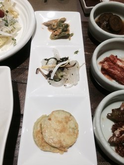 必须排队,必须火爆的一家店。在北京名气很大。他们家的肉类是一绝,种类比其他烤肉店要多一些,虽然价格贵一点,但是他们腌制的手法独特,味道非常赞,像洛杉矶牛排,65元。味道就很棒,肉质超细腻。考起来很好吃。45元的五花肉,相比一般汉拿山的也要贵10多块钱。但是肉多一些,而且烤起来更好吃。王牛排,98元,价格小贵,瘦肉很赞。7成熟的时候刚刚好。蘸料吃特别鲜美。奶酪年糕,也是他们家主打。拉丝清晰,奶酪很香,年糕口感不错。南瓜粥,碗不大,颜色金黄,鲜亮。细润的口感,甜丝丝的味道,非常好喝。泡菜也是很好吃。清爽可口。非常开胃。一盘量很大。生意火,排队多。所以难免嘈杂,但是朋友们一起吃得开心。查看更多