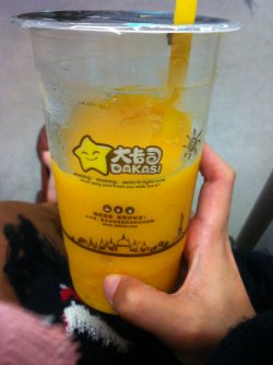 这个牌子的饮品分店不是很多~所以不是到处逛得人真心不一定能看到过~不过味道还是极好的~我点的是芒果冰沙~11块钱~还算公道~我看到他是拿新鲜的芒果咋的汁然后捣成沙冰~所以味道很新鲜~关键很大一杯~清爽解渴!