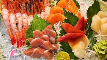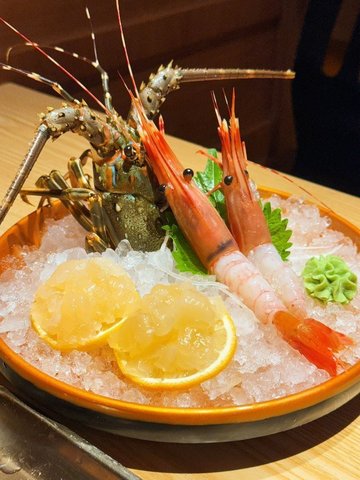 黑松露玻璃虾卷 / 黄花鱼一夜干 / 大盛刺身拼盘 / 北海道冻奶冰淇淋 / 大圣金角 / 土豆泥沙拉