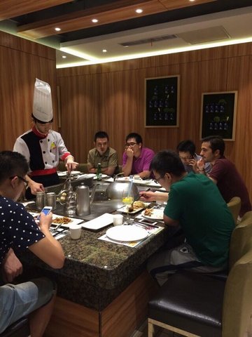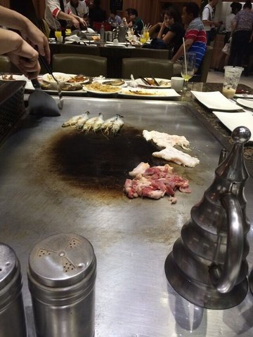 这家店网上评价都不错,那天逛街看到就进去了,环境确实不错,店里面有两块,铁板烧和涮锅,我们本着尝鲜的原则,跑去吃的铁板烧,看菜单就知道很精致了,当然贵肯定是免不了的。。。我们选了秋刀鱼,蒸蛋,丁骨牛排,生蚝,芝士大明虾,鹅肝肉卷还有铜锣烧等,都是师傅在我们面前的铁板上做的,可以看见,觉得蒸蛋蛮有意思的,在鸡蛋的一端打个小孔,然后撒上鱼籽,旁边洒点水,拿个大铁盖子盖住,放在铁板上蒸,过不了很久就好了,还蛮嫩的,鱼籽也好吃,很有意思,第一次这么吃呢~牛排也很嫩,都把骨头剔出去了,就是分量不多,虾子真是我的最爱啊,烤的相当不错,正正好,味道也是很好~~鹅肝肉卷不知道是不是正宗的,毕竟我以前也没吃过,味道当然也挺好,鱼的话真不是我的菜,总觉得很腥,不过看老公吃的很happy。。铜锣烧真的是做的跟面包店差不多,不过香多了,现做的就是好吃~~2个人吃了有200多吧,确实是相当贵哦,还没打折。。。