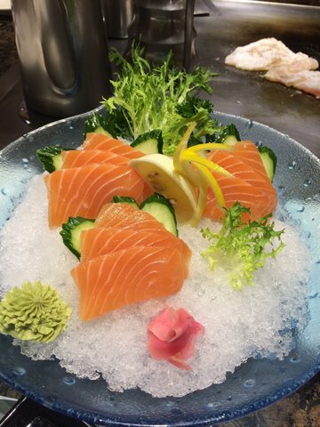 美美的周末来袭,美美的睡上一个懒觉,当然要美美的犒劳下味蕾咯!于是大众点评上一搜,选择了大家评价不错的大菊铁板烧光谷店咯,加之我们自己也对光谷这边的大菊店比较感兴趣,每次来都有新收获——这不,这次的168元套餐让我们一行6人赞不绝口,每2人享受一个套餐,而且今天刚好活动,每个套餐减10元,听服务员说,这个套餐单点的原价是331元呢!没想到我们只要158元,所以瞬间感觉十分实惠,我们又加了爱吃的三文鱼刺身。哇哈哈,每一样都那么美味啊!三文鱼超级新鲜,入口滑嫩嫩的,蘸上芥末酱油,稍稍甜辣之感之冲味觉!配菜黄瓜脆脆滴,原汁原味的甜!
