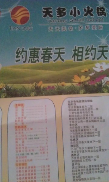 餐厅: 天多小火锅 地址: 昌平区二龙路甲33号新龙大厦B1楼(西三旗桥东北侧)点评:这家小火锅店有点呷哺的感觉,也是吃小火锅的,一个一锅,有普通的桌位也有高脚的座位,环境还不错,挺宽敞的,吃饭不用像呷哺那样排队,饭点人多些,但一般也不用排队,挺好的。服务也可以。蔬菜这些其实大同小异,只要新鲜、干净卫生在哪里吃都是一个味道的,他们家的比较新鲜。酱料有三种好象,麻酱的、香辣酱和香油蒜蓉,而且是免费的,锅底也是免费的,这点很不错的。虽然品种少了些,也没有特别自创的底料,但随意吃吃还是不错的。牛羊肉这些,看着也不错,应该是真的肉,吃着也还好,没看出有啥差别。他们家就是中规中矩,谈不上什么特点,但也不难吃,吃着省心,不用排大队,份量也挺大的,人均消费30元左右,还可以吧。