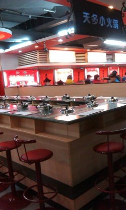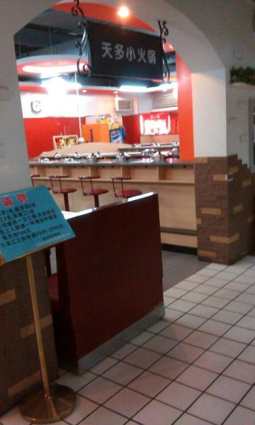 类似呷哺呷哺、咪嘻咪嘻涮涮锅一类的快餐火锅店,一个人一个小锅,这个牌子的火锅除了这里在四道口华联一层还有蒲黄榆那个物美大卖场玉蜓桥店的一层也看见过,都是吧台模式,人流比较大,生意还可以,貌似四道口那个差一些,没看见过等位的,这个店开在地下一层,生意不错,购物的、周边上班的人为主,价格比较低,是随便吃吃、简单午餐简餐的一个比较好的去处.环境比起呷哺好一些,一是没那么多人,主要是等位的,呷哺叫号之类的就够吵的,再加上吧台坐着的,很嘈杂;二是地方相对宽松一些,没呷哺感觉那么挤,舒服一点;服务上这类火锅都差不多,人手不够,人多的时候根本忙不过来,基本上都是稍等,一会儿,结果就忘了,这些服务员在这种环境下一天想起来有点可怕.菜品基本上与一般的快餐火锅差不多,天多小火锅锅底、调料免费,算是一个吸引顾客的小细节,锅底是清汤和麻辣两种,调料有香辣酱、麻酱、香油蒜蓉三种;锅底调料比起其他的地方略少,不过不要钱也就没什么可说的,到哪儿我也只要清汤的,白水就可以.套餐是一盘肉和一份蔬菜拼盘,外送一个烧饼,一般一个人就够了,牛羊肉类比呷哺要便宜1块钱,这里是12,呷哺涨到13了,眼肉18,上脑19也便宜不少,质量还可以,不过这类型的快餐火锅肉的质量比起专门的火锅店差不少,不过来这里也不可能是为了吃肉来,也就凑合了,一盘子约么四两200g左右.调料的味道应该可以说是这类型火锅的灵魂了,这里的麻酱的味道还可以,没有呷哺的甜,咸鲜味更突出一些,但究竟谁好吃就因人而异了,各有各的味道,全凭个人喜好,我个人觉得还可以,挺喜欢这里的味道;丸子类主要就是常见的鱼浆淀粉球,也有牛肉丸、贡丸一类的,各家都差不多.蔬菜就那么回事儿吧,干净新鲜,价格大多比呷哺便宜一些或者一样,菜量不小,也可以双拼盘,5块钱、6块钱、7块钱三种,呷哺现在都是7块钱,总的一顿饭花不了多少钱,比呷哺少两成左右,感觉还可以.总体来讲还可以,但的确没有什么特色,店也很少,没什么知名度;基本上就是模仿,这类火锅本来技术含量就低,缺乏一些创新,如果与成熟品牌正面较量很难存活,只有推出自己的特色才能真正的发展,