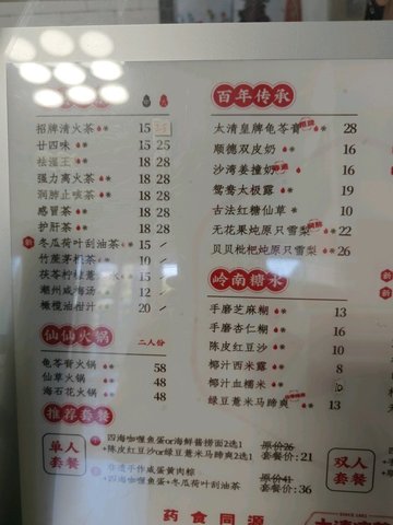 姜撞奶 / 竹蔗茅根茶 / 芒果芋圆仙草 / 皇牌龟苓膏 / 莲子双皮奶 / 冰糖炖雪梨